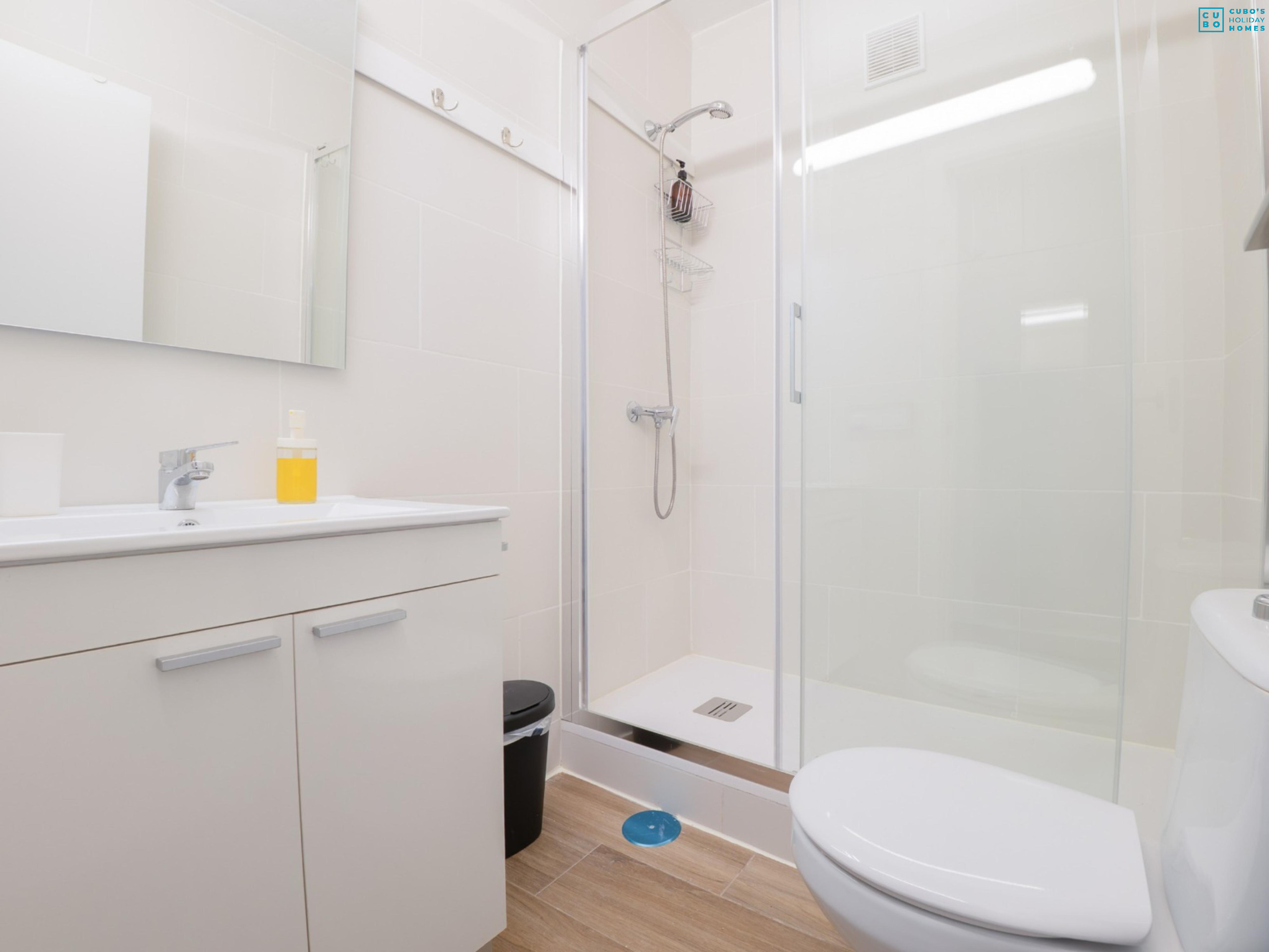 El apartamento dispone de 2 dormitorios con cama de matrimonio (el tercer dormitorio se utiliza como despacho), lo que garantiza descanso y amplitud tanto para familias como para dos parejas. Cuenta con baño completo con ducha, distribución práctica y espacios bien aprovechados.