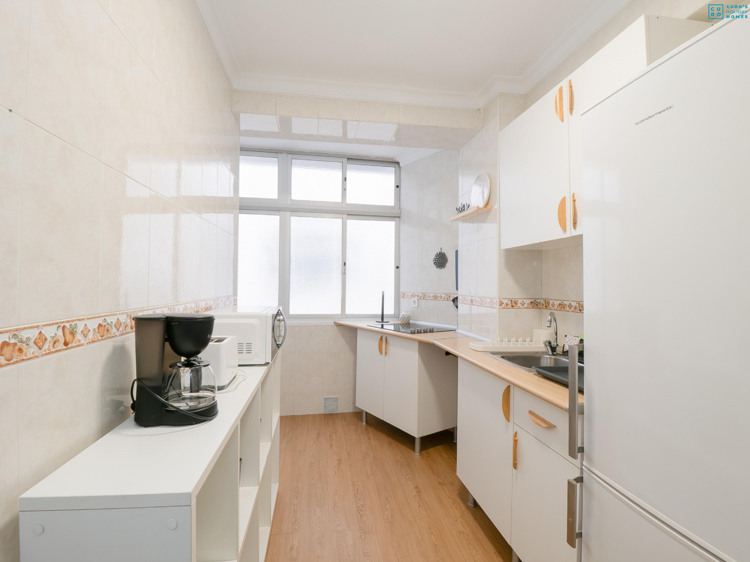 La cocina independiente está totalmente equipada con vitrocerámica, nevera, congelador, microondas, cafetera de filtro, tostadora, hervidor, menaje completo y lavadora integrada, pensada para estancias tanto cortas como largas.