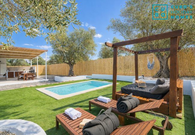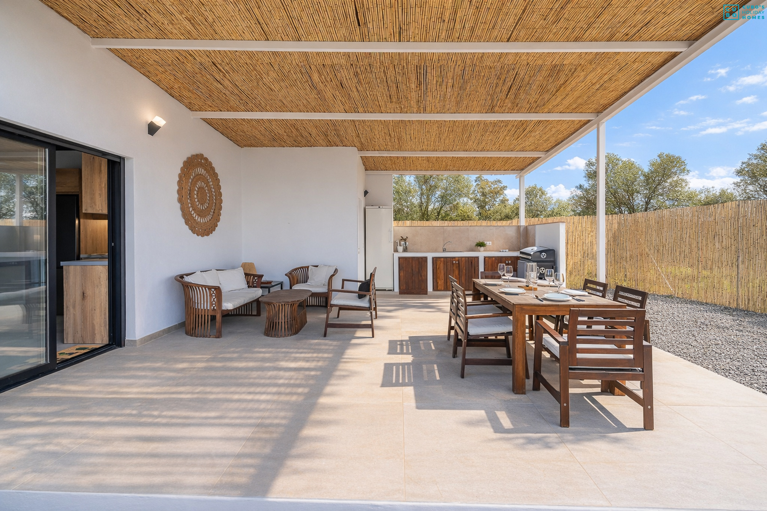 En el exterior, encontrarás una zona de barbacoa con una segunda cocina completa, mesas, sillas, tumbonas y hamacas para relajarte admirando las hermosas vistas a las sierras y el jardín lleno de árboles frutales como naranjas y nísperos, que podrás disfrutar frescos durante tu estancia.