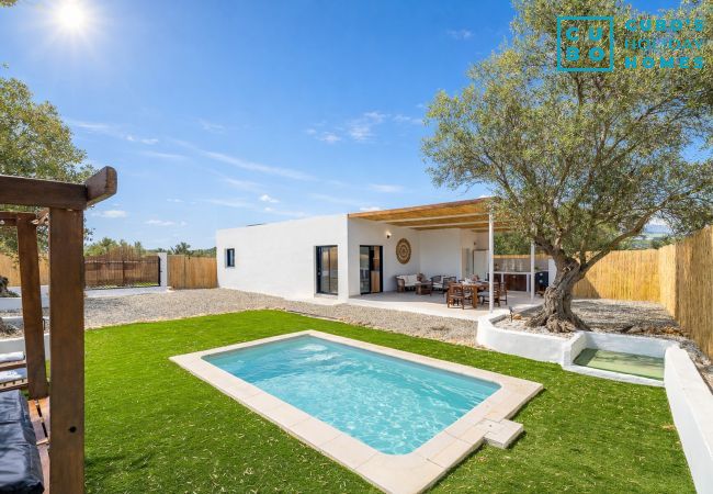 La finca también ofrece una piscina privada disponible todo el año, aire acondicionado en el salón principal y el dormitorio secundario de dos camas individuales, conexión wifi y aparcamiento para dos coches. La tranquilidad del campo andaluz y el precioso entorno natural te esperan para una experiencia inolvidable. El acceso se realiza por camino privado.