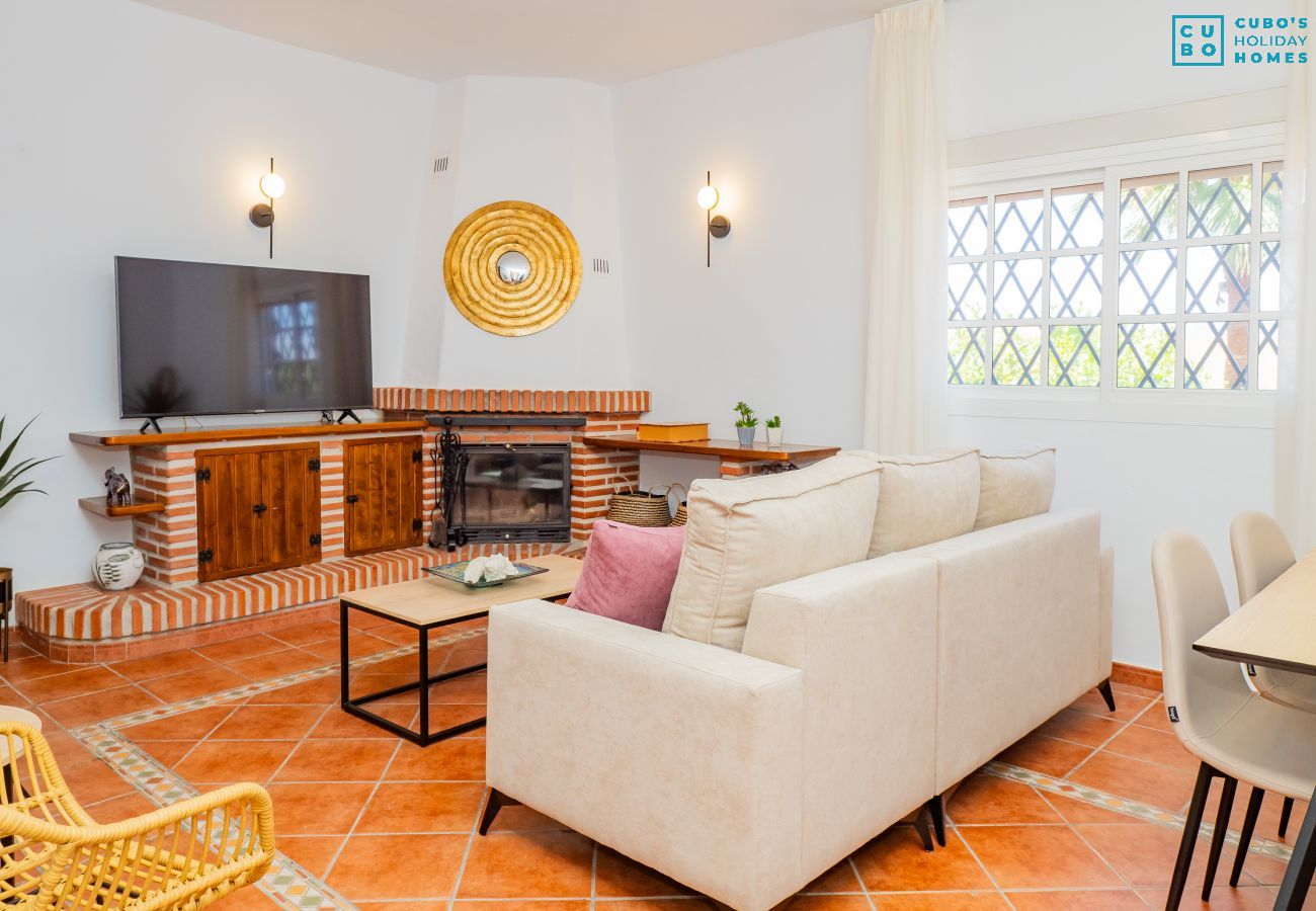 El interior ofrece un salón comedor amplio y luminoso, perfecto para reuniones familiares, con chimenea para las temporadas frías y televisión para el entretenimiento. La cocina contigua está completamente equipada con electrodomésticos modernos como nevera, microondas, horno, lavavajillas, cafetera, tostadora y más, además de un completo menaje de cocina y mesa de resina, ideal para uso en exteriores o para niños.