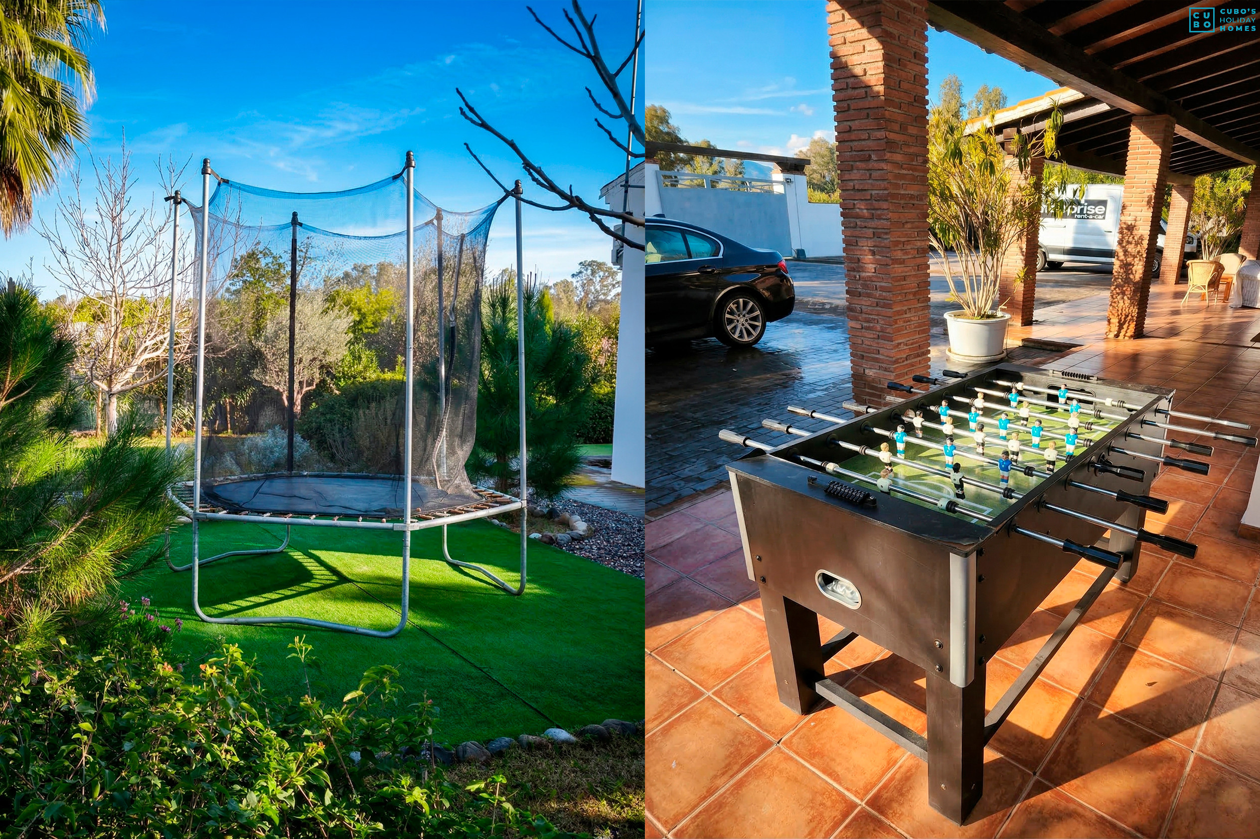 La vivienda ofrece amplias estancias, vistas abiertas a la montaña y un gran jardín privado donde relajarse al aire libre. Cuenta con una terraza de 100 m², piscina privada rodeada de zonas verdes, barbacoa totalmente equipada además de una completa zona de ocio con futbolín, cama elástica, bicicletas y área infantil con toboganes, casita de juegos y otros elementos pensados para los más pequeños.