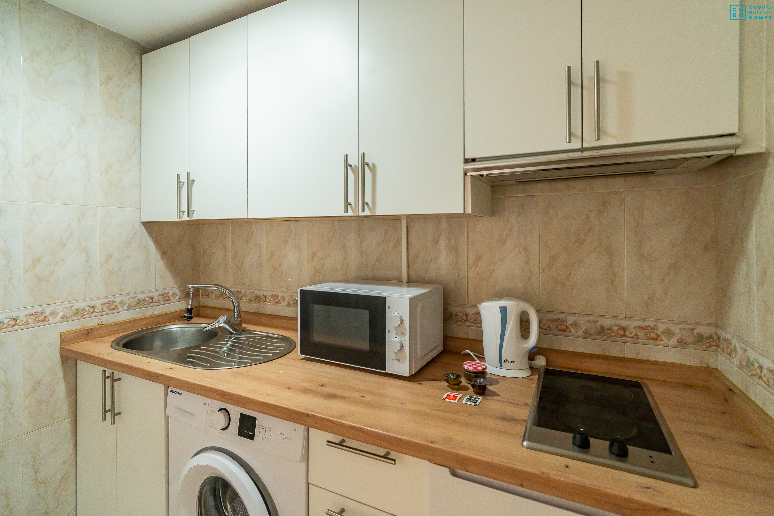 La cocina independiente, equipada con vitrocerámica, nevera, horno, microondas, congelador, cafetera, tostadora, hervidor y exprimidor, cuenta también con lavadora, ofreciendo todo lo necesario para una estancia cómoda tanto en escapadas cortas como en estancias más largas.