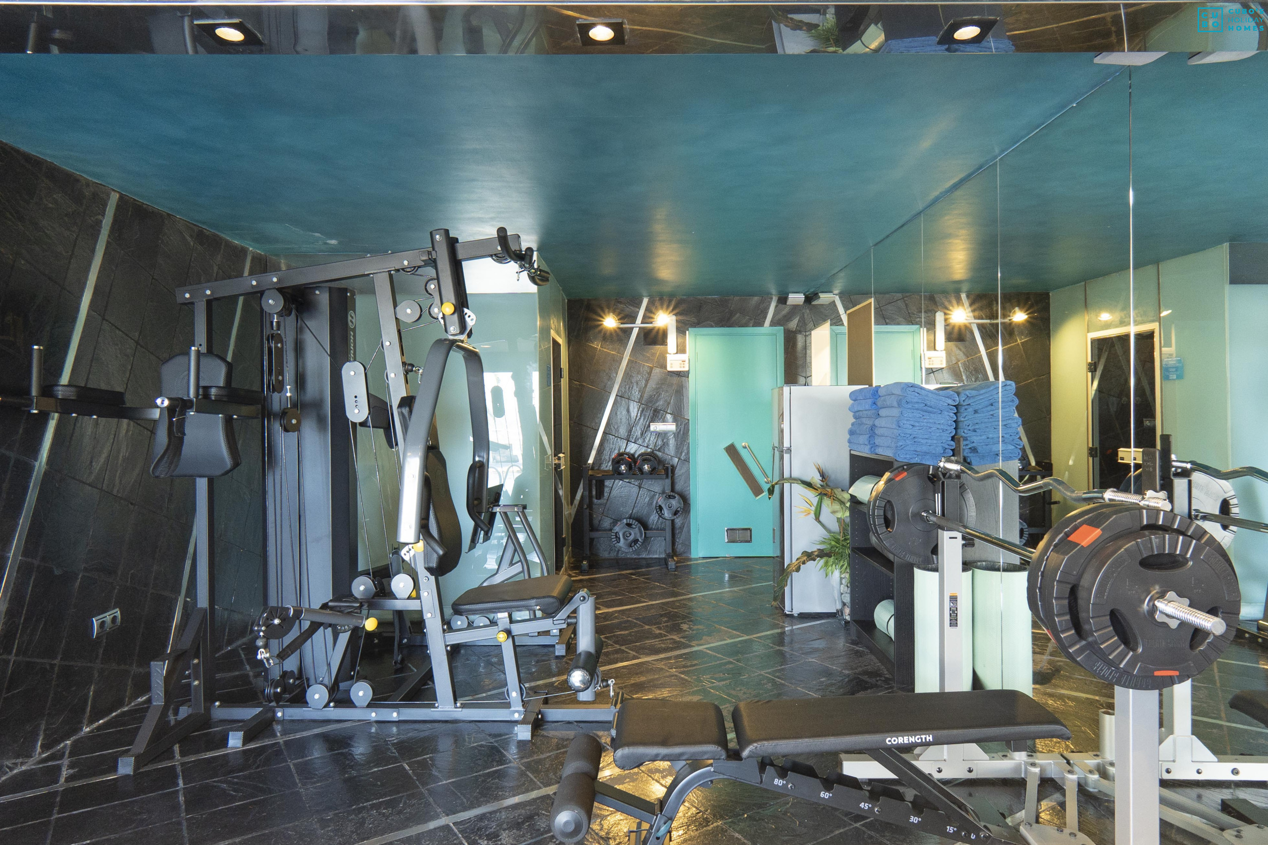 - Salle de sport privée avec poids, tapis de course et machine multifonction.